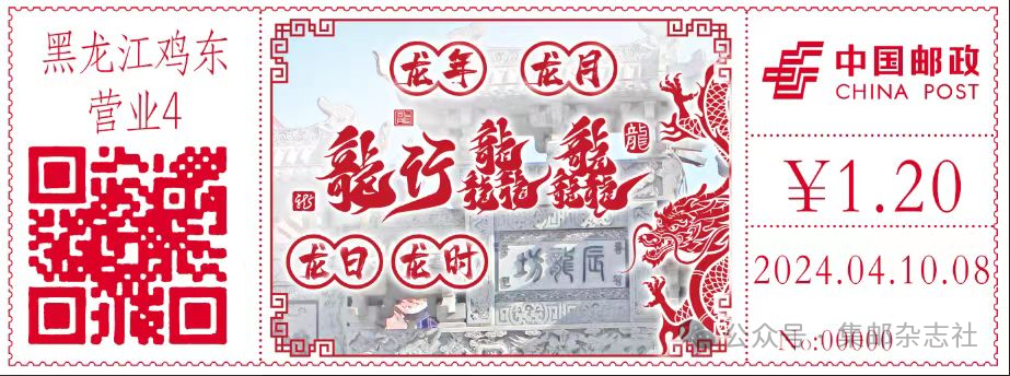 挂号实寄邮资片使用《美在黑龙江》邮资明信片加印片为载体,启用首日加盖邮资机戳,另贴《甲辰年》邮票一套,盖销纪念邮戳及“黑龙江鸡东 辰龙坊”临时日戳,挂号实寄给预订者。识别上方二维码即可预订。