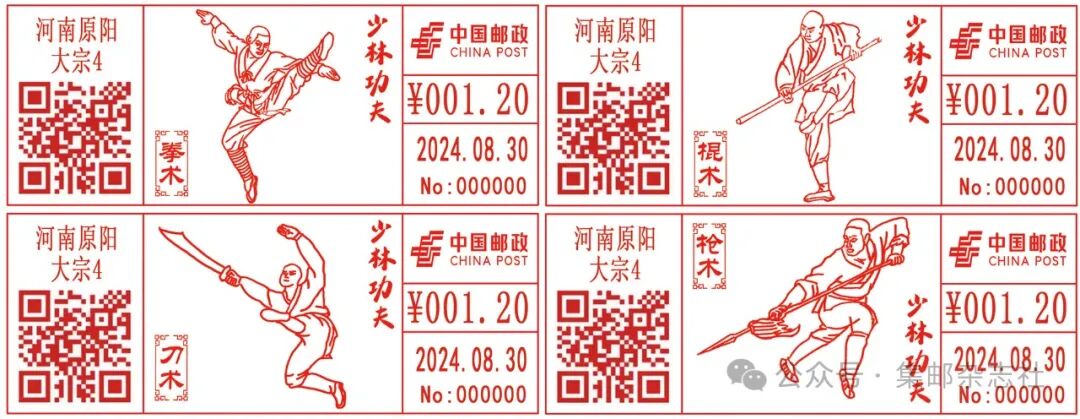 经中国邮政集团有限公司批准,河南省原阳邮政分公司将于2024年8月30日启用“少林功夫”彩色数字打印型邮资机戳一组4枚,图案分别为拳术、棍术、刀术和枪术。为方便大家收藏,《集邮》杂志微店上架了该组邮资机戳的两款实寄产品。