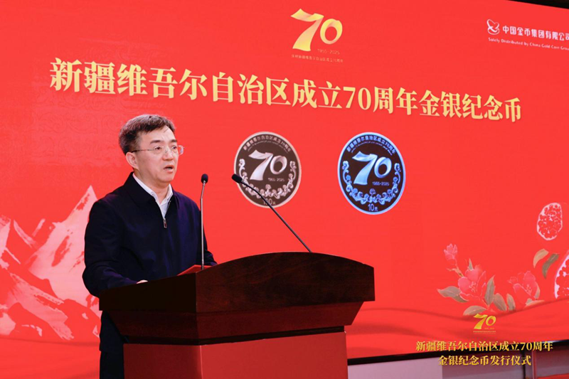 新疆维吾尔自治区党委常委、统战部部长,新疆维吾尔自治区成立70周年庆祝活动筹备工作领导小组副组长、办公室副主任伊力扎提·艾合买提江发表致辞。他在致辞中表示,以新疆维吾尔自治区成立70周年为主题,发行国家法定的金银纪念币,是习近平总书记和党中央特殊关怀的直接体现,充分展现习近平新时代中国特色社会主义思想和新时代党的治疆方略、民族区域自治制度在新疆的成功实践,充分展示70年来特别是新时代以来新疆经济社会发展取得的历史性成就,充分彰显中国共产党领导政治优势、中国特色社会主义制度优势和中国特色解决民族问题正确道路的巨大优越性,有利于引导新疆各族人民更加紧密地团结。