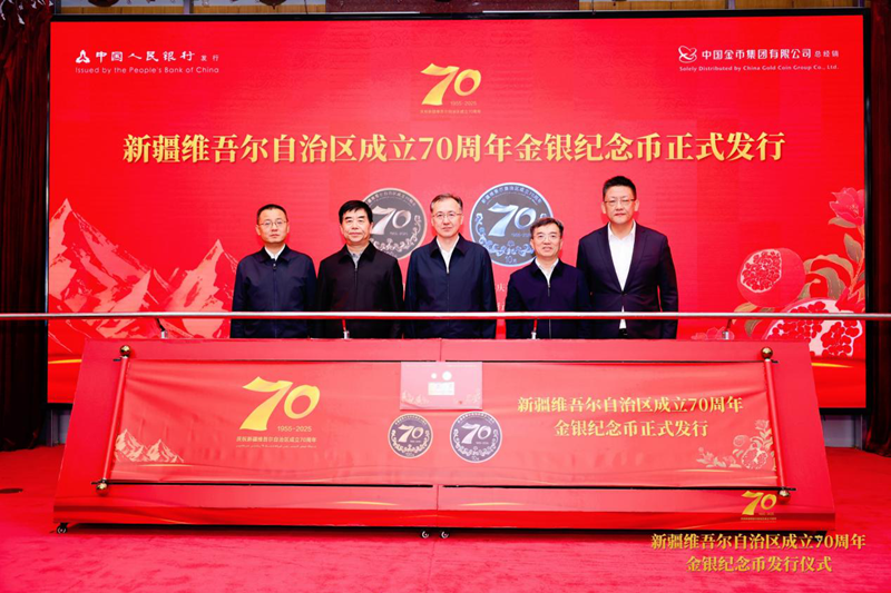 同日,新疆维吾尔自治区成立70周年金银纪念币发行仪式在中国人民银行新疆维吾尔自治区分行隆重举行。新疆维吾尔自治区党委常委、统战部部长,新疆维吾尔自治区成立70周年庆祝活动筹备工作领导小组副组长、办公室副主任伊力扎提·艾合买提江;中国人民银行货币金银局(保卫局)局长罗锐;中国金币集团有限公司党委书记、董事长焦瑾璞;新疆维吾尔自治区党委宣传部常务副部长,新疆维吾尔自治区成立70周年庆祝活动筹备工作领导小组办公室宣传文艺组副组长赵江涛;中国人民银行新疆维吾尔自治区分行党委书记、行长王兵等出席仪式。