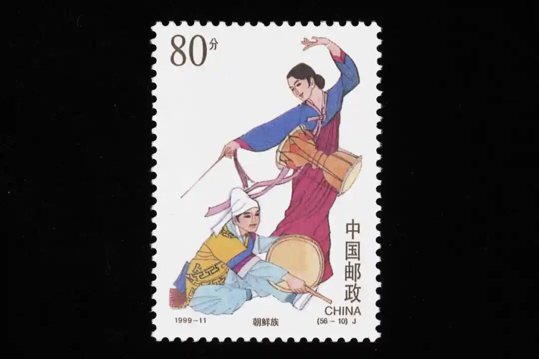 中国朝鲜族农乐舞在表演时一部分人手持大金、长鼓、圆鼓等乐器,既伴奏也舞蹈,另一部分人则装扮成各种角色,随歌起舞,场面热烈。邮票画面中是一对身着朝鲜族传统服饰的男女,女子手持长鼓,男子手抚圆鼓,气氛欢乐祥和。