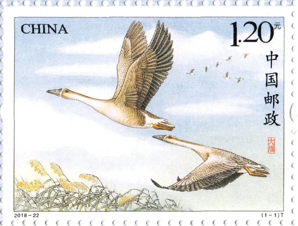 邮票画面主体为一雄一雌、比翼双飞的大雁,背景为呈人字形排列、在天空中飞翔的7只大雁,细数画面下方的芦苇也是7支,“7”与“7”,寓意农历七月初七——七夕节,与本枚邮票的发行时间相呼应,以表达对美好爱情的祝福。