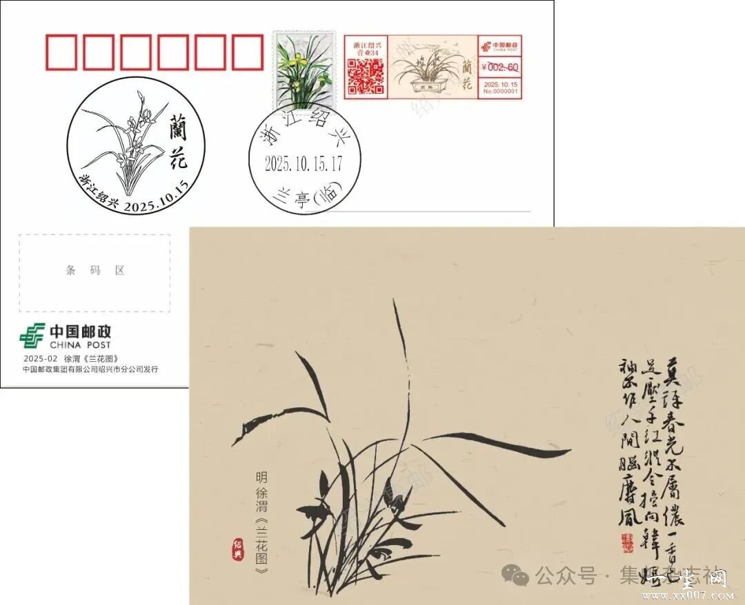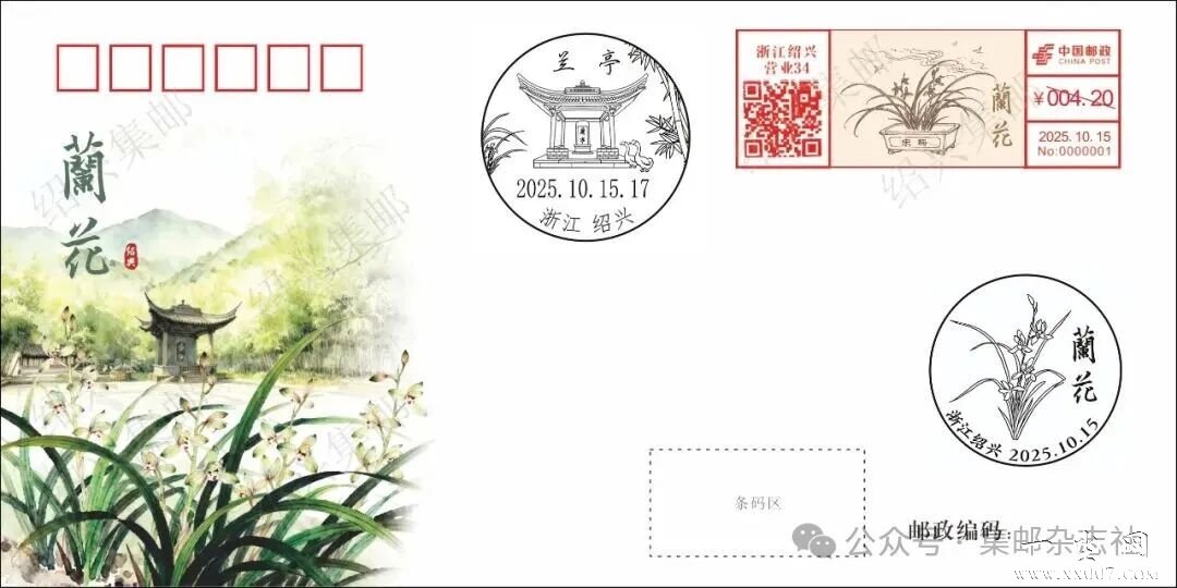 包含一封一片,使用美术封、美术明信片为载体,均加盖浙江绍兴邮政分公司启用的“兰花”彩色数字打印型邮资机戳,实寄封加盖兰亭风景日戳和兰花纪念戳;美术明信片分别加盖兰亭临时日戳和兰花纪念戳,启用首日挂号实寄给预订者。识别上方二维码即可预订。