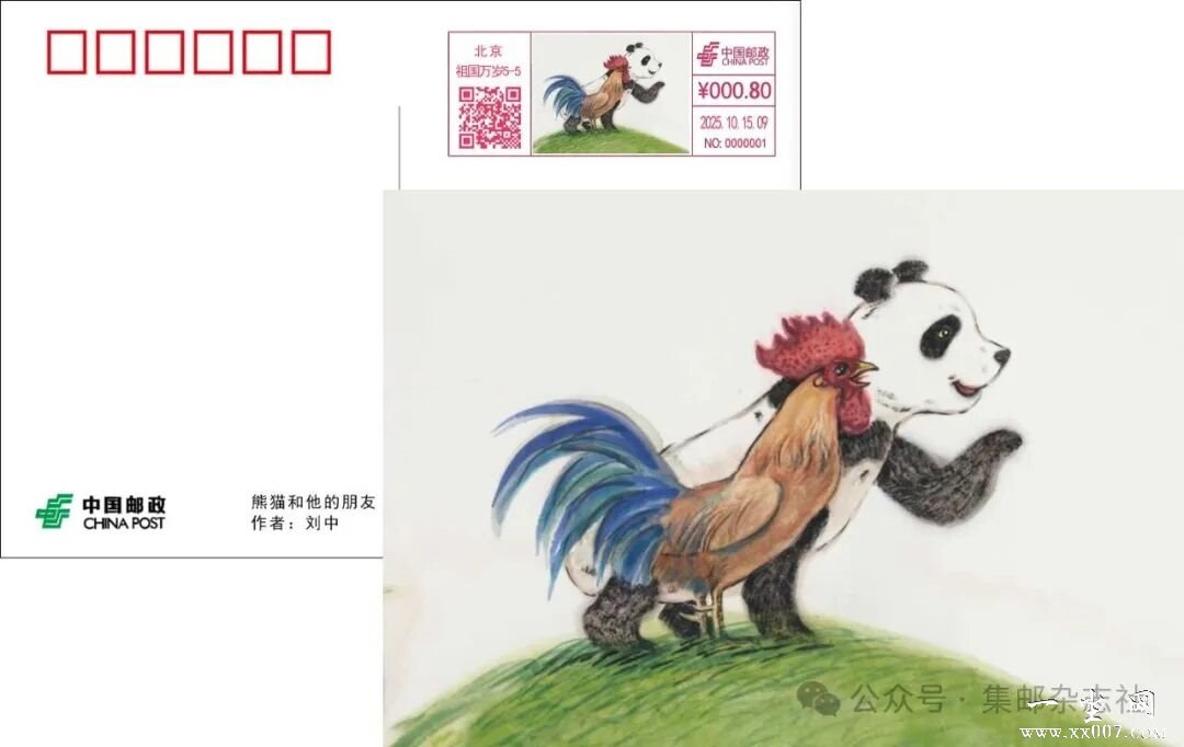 该邮资机戳主图为熊猫和摩纳哥国鸟雄鸡。采用我国著名画家刘中绘制的《国宝丝路五洲行》长卷中的部分图案设计而成。