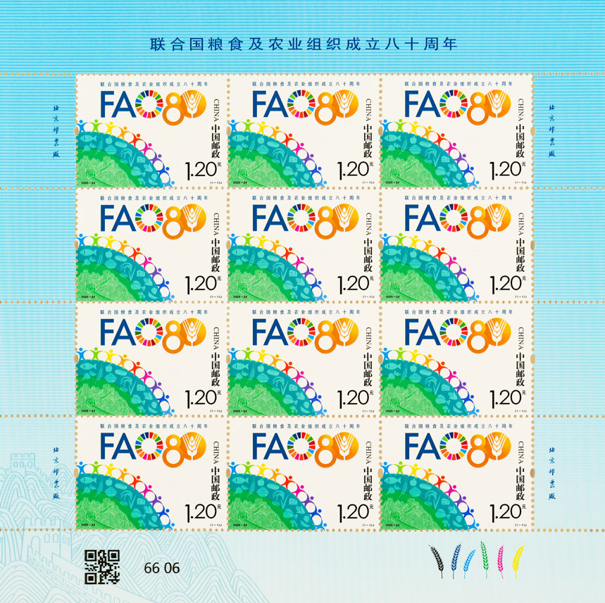 中国邮政定于2025年10月16日发行《联合国粮食及农业组织成立八十周年》纪念邮票1套1枚。详情如下: