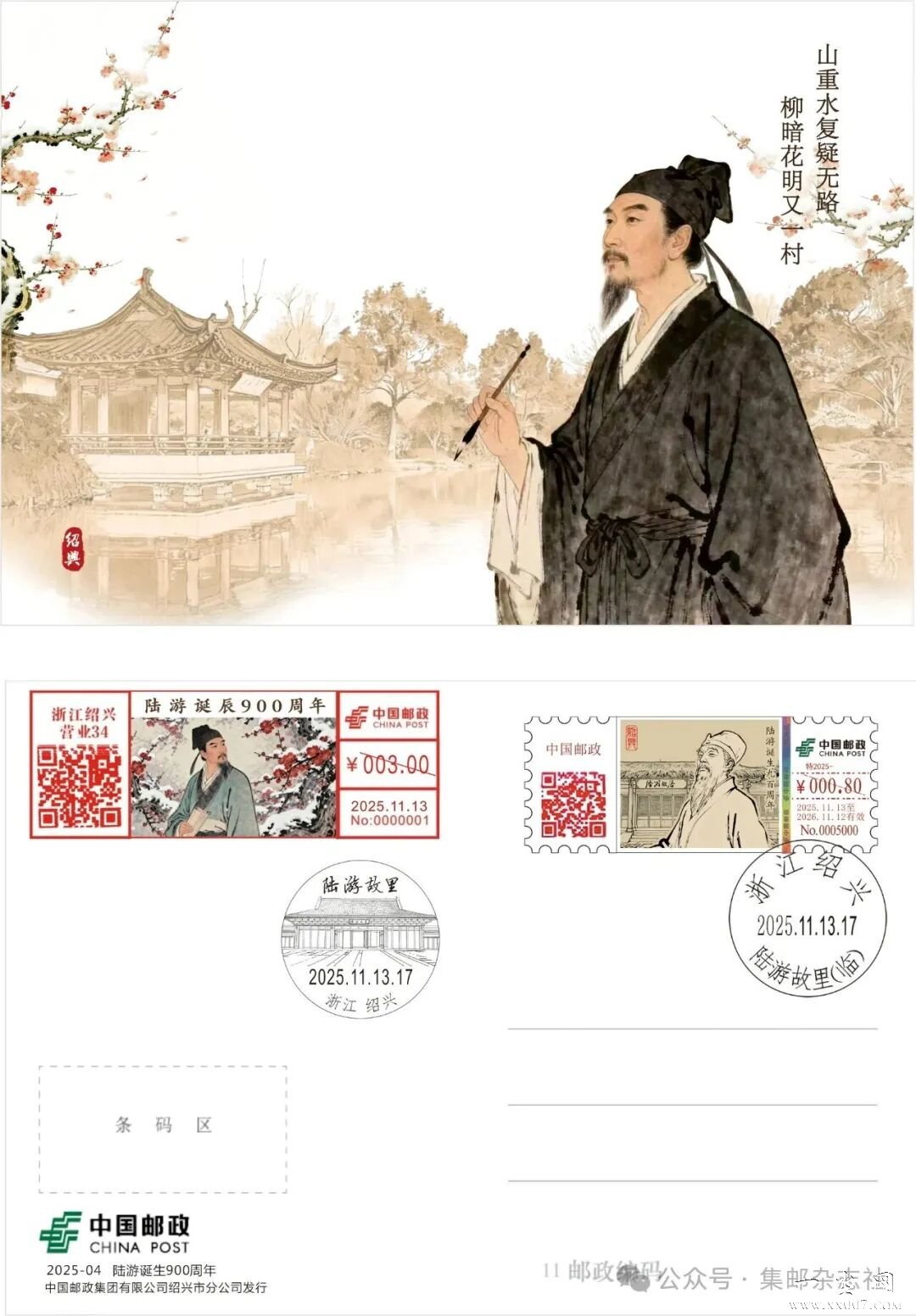 使用美术明信片为载体,加盖0.80元面值粘贴型邮资机戳一枚,加贴“陆游”邮票一枚,使用打印型邮资机戳补资,另盖临时日戳及纪念邮戳,启用首日挂号实寄给预订者。识别上方二维码即可预订。