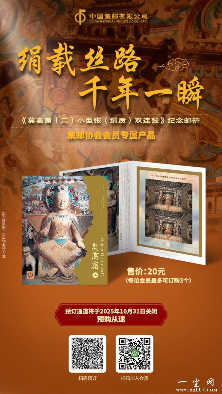 《莫高窟(二)小型张(绢质)双连张》纪念邮折当前正在火热预售中,预订通道(海报上的预订二维码)将于2025年10月31日18时关闭,预订从速,不要错过。