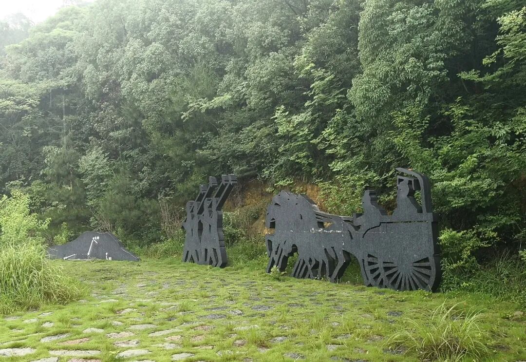 山顶的高庙供奉着高庙娘娘,由山门旁立着的清代石碑可知娘娘庙的历史悠久。据说每年4月17日是高庙娘娘的生日,前来朝拜的善男信女络绎不绝。穿过高庙西下, 有一巨石神似大象的鼻子而被称为“象鼻山”,并形成了一个石洞和一座天然石桥。这座石桥高约三四米,被当地人称为“奈何桥”,传说这里是秦始皇行宫遗迹(图2)。 凡人到此攀崖过桥,可以感受生死交替,领悟人生如梦的真谛。象鼻山下有一片较开阔的绿地,矗立着秦始皇驾车南巡模型、南巡线路图等(图3),似为秦始皇当年屯兵之处。