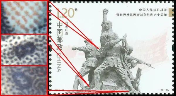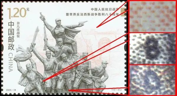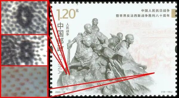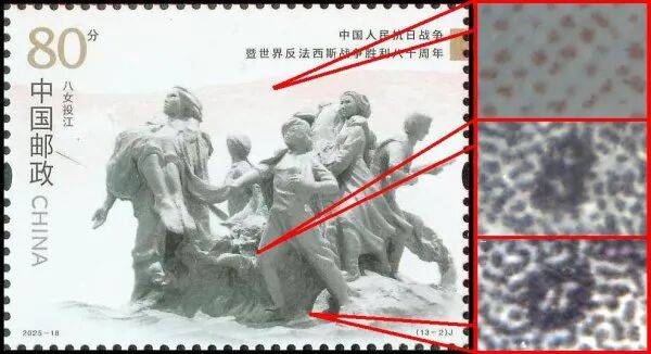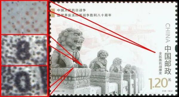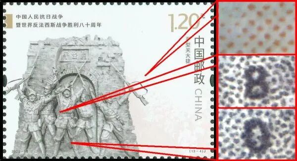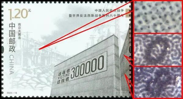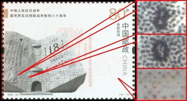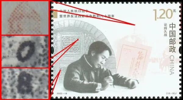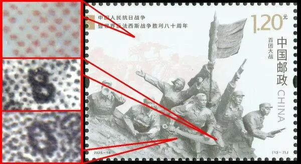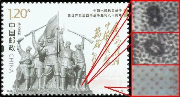 9月3日发行的2025-18《中国人民抗日战争暨世界反法西斯战争胜利八十周年》邮票由北京邮票厂有限公司采用金、红、浅咖啡、灰、黑5色调频网胶印印刷。防伪方式上除《新邮通告》公布的防伪纸张(彩点荧光防伪纸张)、防伪油墨(灰色显褚红色荧光防伪油墨)、异形齿孔(两竖边中间各有一椭圆形齿孔)和荧光喷码,还采用了缩微文字和局部调幅网胶印。