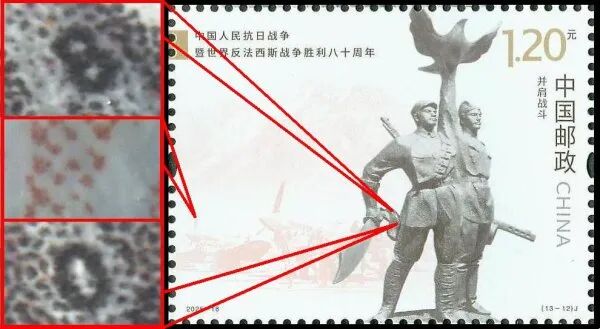 第13枚邮票“伟大胜利”上的缩微数字位于票图右侧高举步枪战士的左小腿两侧,数字“8”的字头朝左上,横坐标约是27.7毫米,纵坐标约是3毫米。数字“0”的字头朝左上,横坐标约是29.5毫米,纵坐标约是3.8毫米。票图背景中右侧的主席台上有调幅网胶印的浅咖啡色网点。