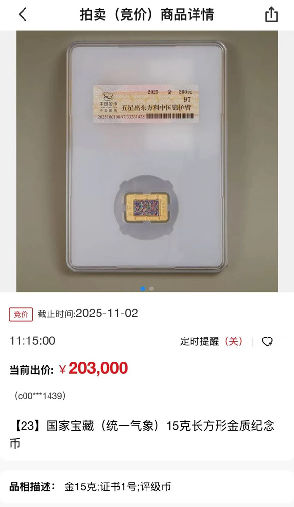 | 20 | 1号币-国家宝藏(统一气象)15克长方形金质纪念币 | 15,800 | 209,090.00 |