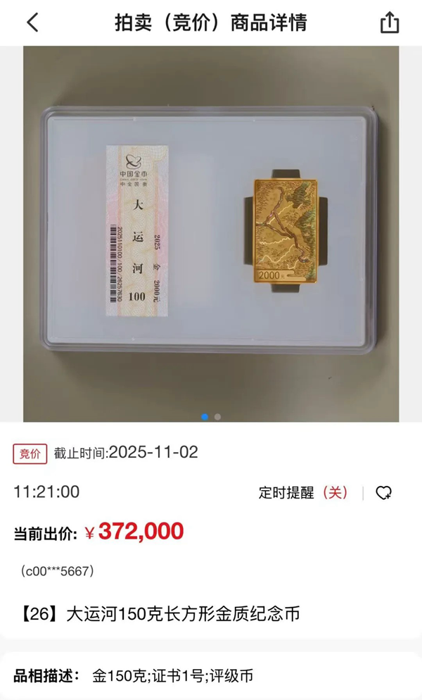 150克金币展现了大运河的“人”字形全貌和宏伟画卷,结合贝母镶嵌工艺、仿珐琅彩工艺、光变麟彩工艺等,再现大运河之繁荣、鼎盛之景象。这枚150克金币,在本场竞拍中,最终以383,160元的价格成交(含佣金)。