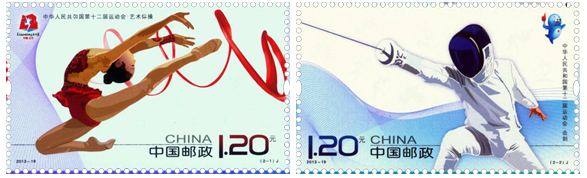 2013年8月31日,中国邮政发行《中华人民共和国第十二届运动会》纪念邮票一套2枚,小全张1枚。邮票图案为“艺术体操”和“击剑”。中华人民共和国第十二届运动会于2013年8月31日至2013年9月12日在辽宁省举行。本届全运会以改革创新和节俭办赛为重要理念,在项目设置、参赛规模、竞赛安排等方面进行了较大的调整和改革。