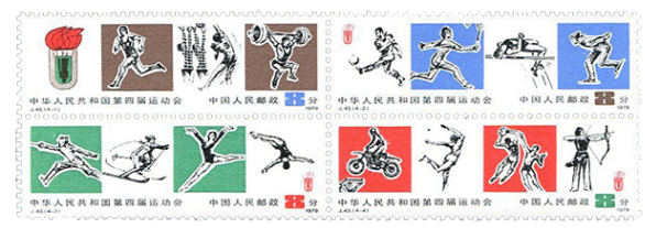 1979年9月15日,中国邮政发行《中华人民共和国第四届运动会》纪念邮票,全套4枚。图案分别为“会徽、跑步、排球、举重”“足球、羽毛球、跳高、滑冰”“击剑、滑雪、体操、跳水”和“摩托车、乒乓球、篮球、射箭”。四运会于1979年9月15日至9月30日在北京召开。此次全运会首次加入了火炬传递环节,有来自全国30个省、自治区、直辖市(包括台湾省在内)和解放军组成的31个代表团的15189名运动员参加了比赛。