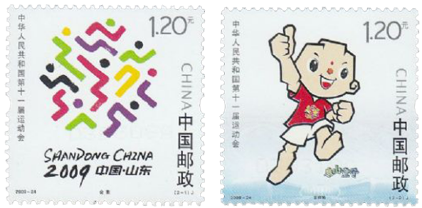 2009年10月16日,中国邮政发行《中华人民共和国第十一届运动会》纪念邮票,全套共2枚。邮票图案分别为“会徽”和“吉祥物”。中华人民共和国第十一届运动会于2009年10月16日在山东省举行。这一届全运会适逢共和国成立60周年、全运会创办50周年,是2008年北京奥运会后对我国竞技体育和群众体育的大检阅,是一次具有特殊重大意义的体育盛会。