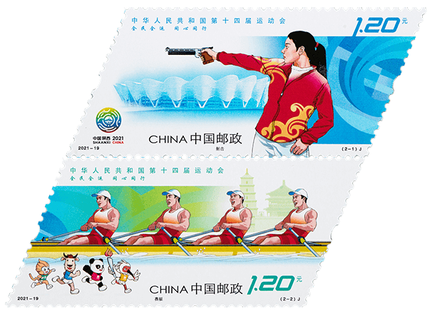 2021年9月15日,中国邮政发行《中华人民共和国第十四届运动会》纪念邮票一套2枚,小全张1枚。邮票图案为“射击”和“赛艇”。画面以蓝、绿色为主色调,运用平行四边形票幅结合连票设计形式表现。画面同时表现了会徽、吉祥物、场馆以及大雁塔、西安钟楼等元素。第十四届全国运动会于2021年9月15日至9月27日在陕西省举行,这是全运会第一次在陕西举办,同时也是第一次在中西部城市举办。