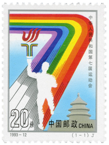 1993年9月4日,中国邮政发行《中华人民共和国第七届运动会》纪念邮票,全套1枚。邮票图案描绘了一位运动员高举火炬,其身后为一条彩虹,火炬是七运会的会徽,火炬的火焰由罗马字母Ⅶ(七)字变形而成,火炬手柄成跑道造型,由两个相反的“7”字组成。彩虹呈阿拉伯数字“7”字形,右下方为北京天坛。第七届全运会首次由多个地区共同承办,分设北京和四川两个主赛区,是展示中国体育发展成果和良好精神风貌的一次盛会。