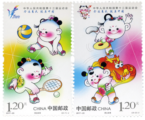 2017年8月27日,中国邮政发行《中华人民共和国第十三届运动会》纪念邮票一套2枚,小全张1枚。中华人民共和国第十三届运动会于2017年8月27日至9月8日在天津市举办。本届全运会以“全运惠民,健康中国”为主题,有1万余名专业运动员围绕33个竞赛项目展开角逐。本届运动会增设了19个大项、126个小项的群众体育比赛项目,吸引了7000余名群众体育爱好者参赛。