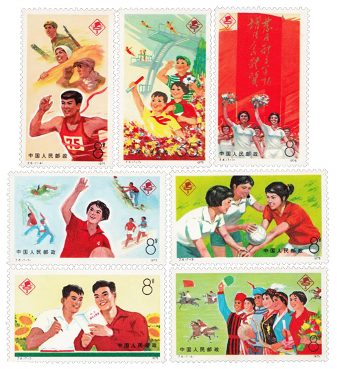 1975年9月12日在中华人民共和国第三届运动会开幕当天,中国邮政发行这套《中华人民共和国第三届运动会》纪念邮票,一套7枚,每一枚邮票的上角均印有本次运动会的会徽。1975年9月12日至28日,第三届全国运动会在北京举行。这届运动会的比赛分成年组和少年组,比赛项目成年组有28项,少年组有8项,另有民族传统体育(马术、秋千、跳板、民族摔跤)、飞机跳伞、摩托车和水上摩托艇等表演项目以及幼儿体育表演。