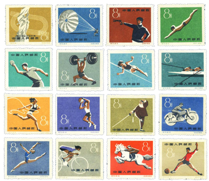 第一届全运会于1959年9月13日在北京开幕。毛泽东、刘少奇等中国领导人出席了开幕式。运动会共设36个比赛项目,有7人4次打破4项世界纪录,664人844次打破和刷新106项全国纪录。1959年12月28日,为纪念中华人民共和国第一届全国运动会,中国邮政发行《第一届全国运动会》纪念邮票,一套16枚。整套邮票展现出中国运动员奋发努力的精神风貌和中国发展体育事业的勃勃雄心。