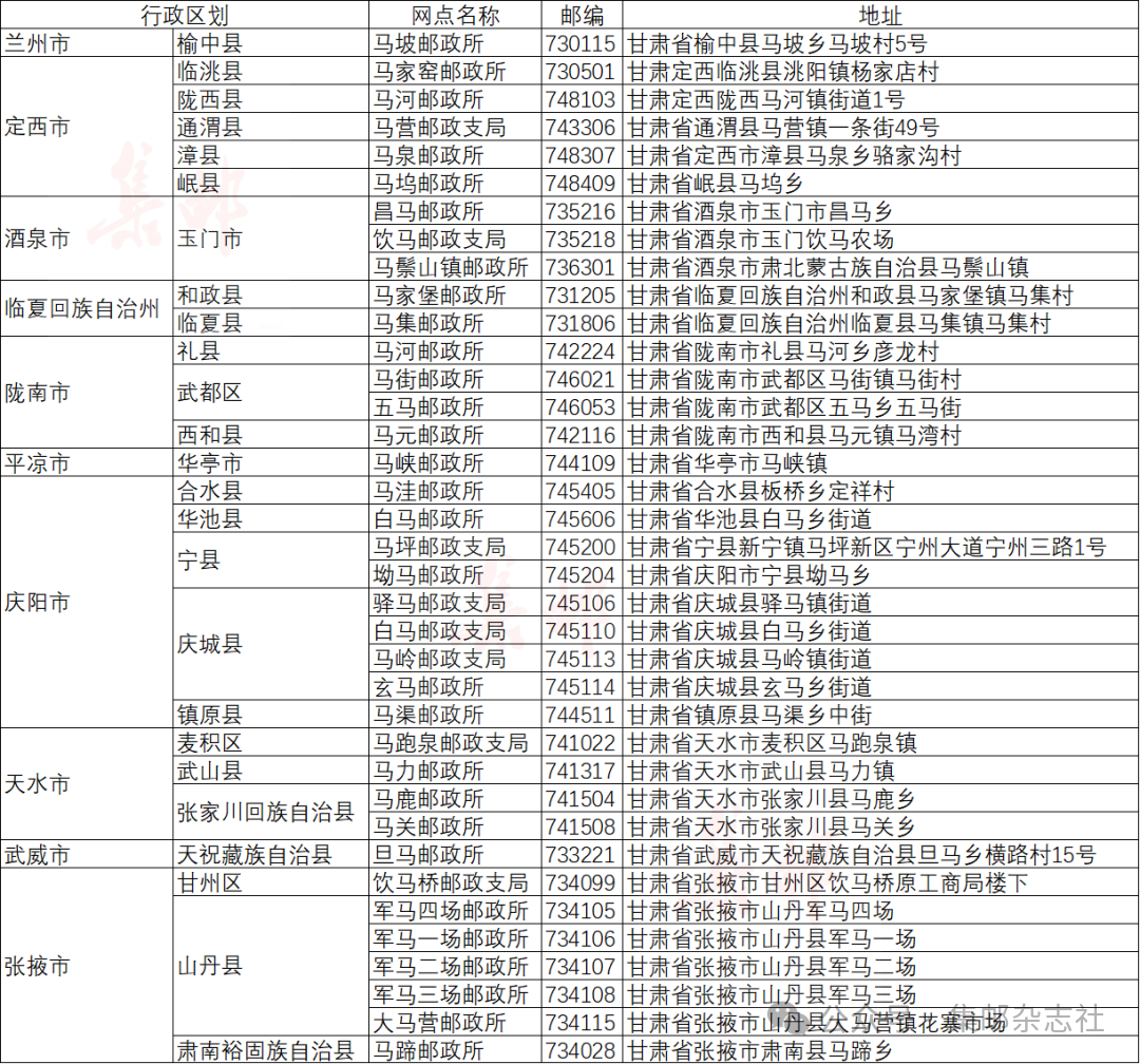 今天为大家介绍甘肃省邮政分公司下属带有“马”字的邮政网点。