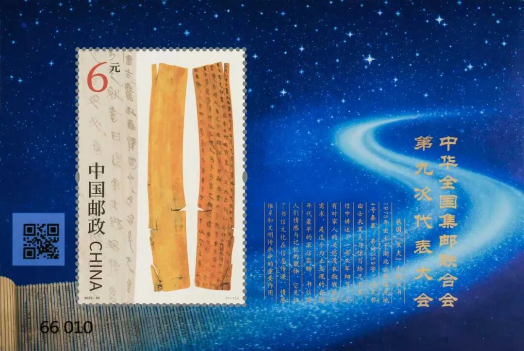 如果您有机会参观位于武汉的湖北省博物馆,走进“极目楚天——湖北古代文明展”展厅,被人群层层围绕的那件展品,一定就是《中华全国集邮联合会第九次代表大会》小型张邮票主图的实物——云梦秦简中的“黑夫”木牍家书了。“黑夫”木椟是中国迄今为止发现最早的家书实物,距今已有两千多年历史。它不仅是研究秦代军事、社会生活和文字(秦隶)的重要文物,更以平民视角展现了两千多年前普通人的情感与生存状态,具有极高的历史与人文价值。