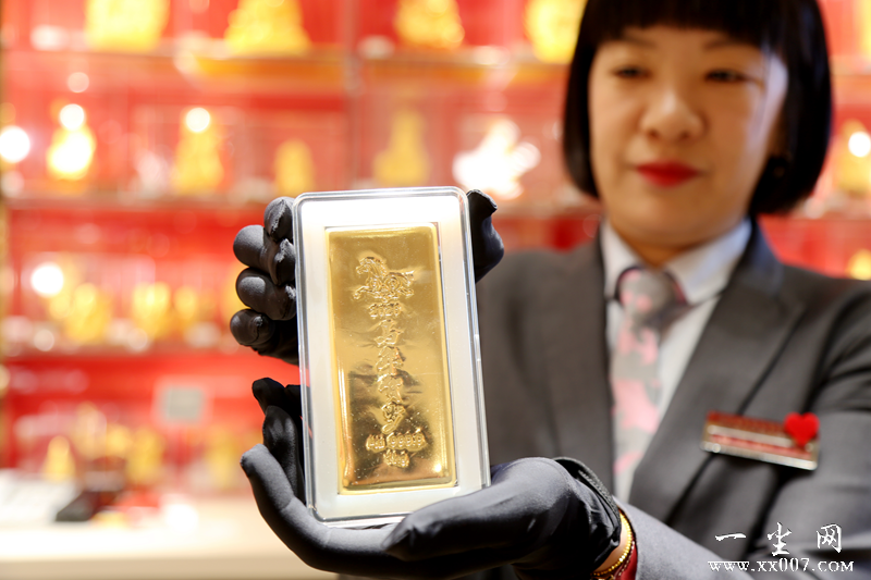 菜百总店工作人员展示马年1公斤贺岁金条