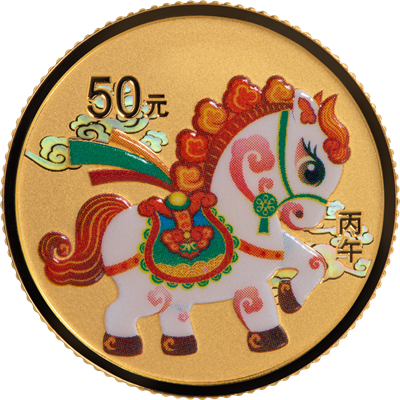 丙午(马)年3克金币背面图案为一匹白色小马驹,白色的马象征高贵、纯洁、权力和自由,在中西方文化中各领风骚。中国古代白马大多是帝王、将帅的坐骑;东汉时白马驮着佛经来到洛阳,佛教自此在中国生根发芽;《西游记》中唐僧骑着白龙马取得真经。在西方世界里,象征祥瑞的独角兽本体就是白色的马;童话故事中王子骑着白马解救公主,白马王子遂成为英俊、富有、能力强大男士的代称。