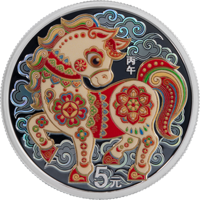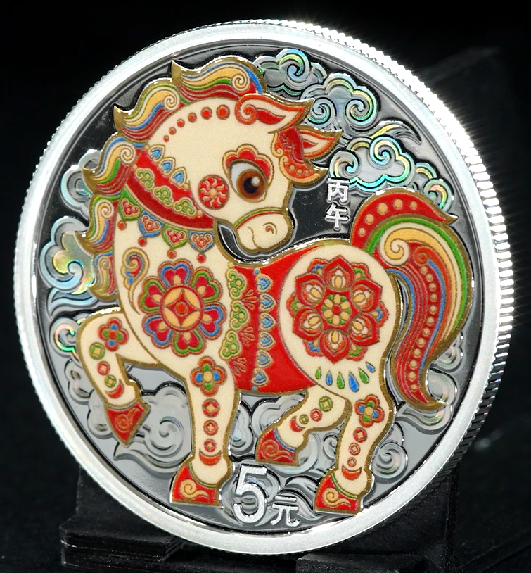15克银币上的小马驹,眼睛晶莹剔透,眉毛幻化成三片红色花瓣,带着机灵可爱劲儿,又透着神性。马身以米黄色和大红色为主色调,衬以清爽的绿色、蓝色,并结合镀金工艺,呈现出珐琅彩的绚丽光泽。在中国民俗传统中,大米是富饶、丰收和繁荣的象征,红色是喜庆的主打色,而绿色和蓝色又把米色和红色衬托得更加鲜明、靓丽,成功塑造了一匹奢华而不奢靡、高贵而不张扬,浑身散发着喜庆祥和气息的神驹。