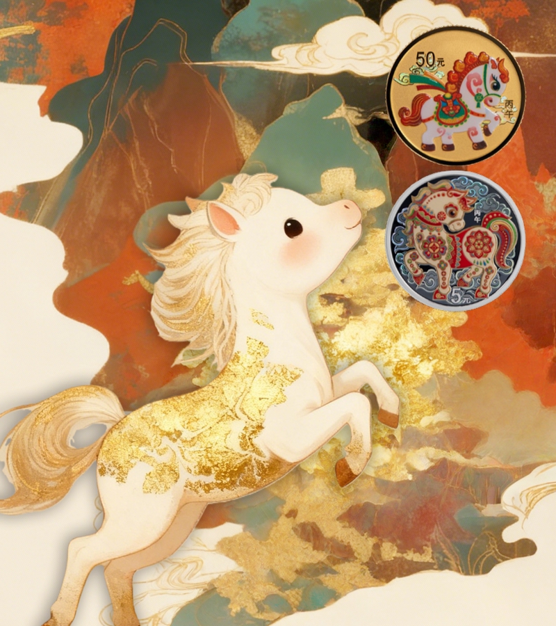 两枚纪念币背面图案均以小马驹为原型,加入多种喜庆吉祥元素,形成了别具匠心的“装饰马”形象,那漂亮可爱的样子让人忍不住想第一时间拿在手里,细细赏玩。图案背景衬以缭绕的祥云,营造了如梦似幻的仙境氛围,将普通的小马驹升华为象征福运的灵兽,恍如上界的神驹临凡,降下祥瑞,让2026农历马年充满欢声笑语。