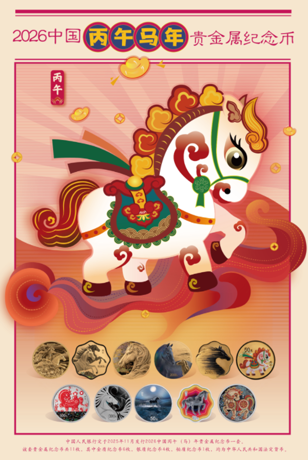 为弘扬中国生肖文化,迎接中国农历马年的到来,中国人民银行发行2026中国农历丙午(马)年贵金属纪念币一套。该套纪念币共11枚,其中金币6枚,银币4枚,铂币1枚,均为中华人民共和国法定货币。