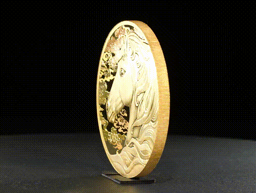 中国现代币章工艺部分来自于西方,而我们的生肖币一直坚持对传统艺术视觉图形进行研究、吸纳、创新,设计出具有民族性、独创性的生肖题材艺术作品。就像这枚金币,即是通过一定的艺术手法结合传统的吉祥寓意来塑造生肖马形象。自古以来,马就是速度、自由与力量的象征,骏马造型加上层叠的祥云,组合在一起就是“天马踏祥云”,其奔腾于九天的姿态,也象征着一种不拘一格、勇往直前的民族精神。币面构图饱满、风格华丽,也寄托了对马年风调雨顺、万事顺遂、国泰民安的美好祈愿。