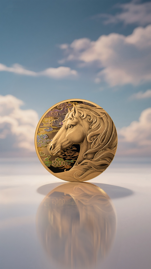 但如果只有写实的马形象,似乎又少了几分韵致,不符合华夏民族含蓄中见真章的审美特点,所以写实有了,还要有表意。在继承生肖币追求写实的传统基础上,这枚大规格金币通过局部纹饰的创新,呈现出新的艺术风貌,这就是表意。币面背景刻画层叠的祥云,并通过丰富的层次变化,增强节奏感与中国韵味。祥云,寓意祥瑞之云气,表达了吉祥、喜庆、幸福的愿望以及对生命的美好向往。币面上,设计者以流畅的曲线和柔和的色彩表现出流云的层叠形态,其中有卷云纹、朵云纹、流云纹等多种表现形式,具有强烈的艺术美感和装饰效果。