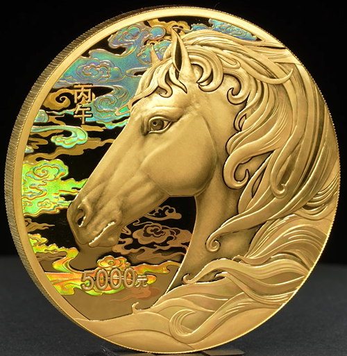 币面采用半清边的形式,使“主角”更加突出,彰显马的无拘无束。背景云纹在浮雕与激光基础上,采用传统绘画“渲染技法”,融合绿、红、褐等色彩,通过彩喷、光变鳞彩工艺形成层次丰富的变化,既模拟出了云气“缥缈变换”的质感,又以色彩丰富性与主体马匹的“素净金调(繁简对比,彩素呼应)”形成相互映照的视觉关系。这种大胆活泼的用色和工艺处理,充分调动起观赏者的视觉动感,其既以丰富的色彩层次和细腻的光影变化传递出生肖马文化中自由奔放的审美意蕴,亦使生肖马这一形象深植民族化的文化内涵和美学法则,不仅提升了这枚大规格金币的文化价值,更使生肖马形象从自然界的动物升华为富有内涵的文化图腾。这个马踏祥云的形象圣洁高远,洋溢着自然生命的活力和艺术清新的美感。