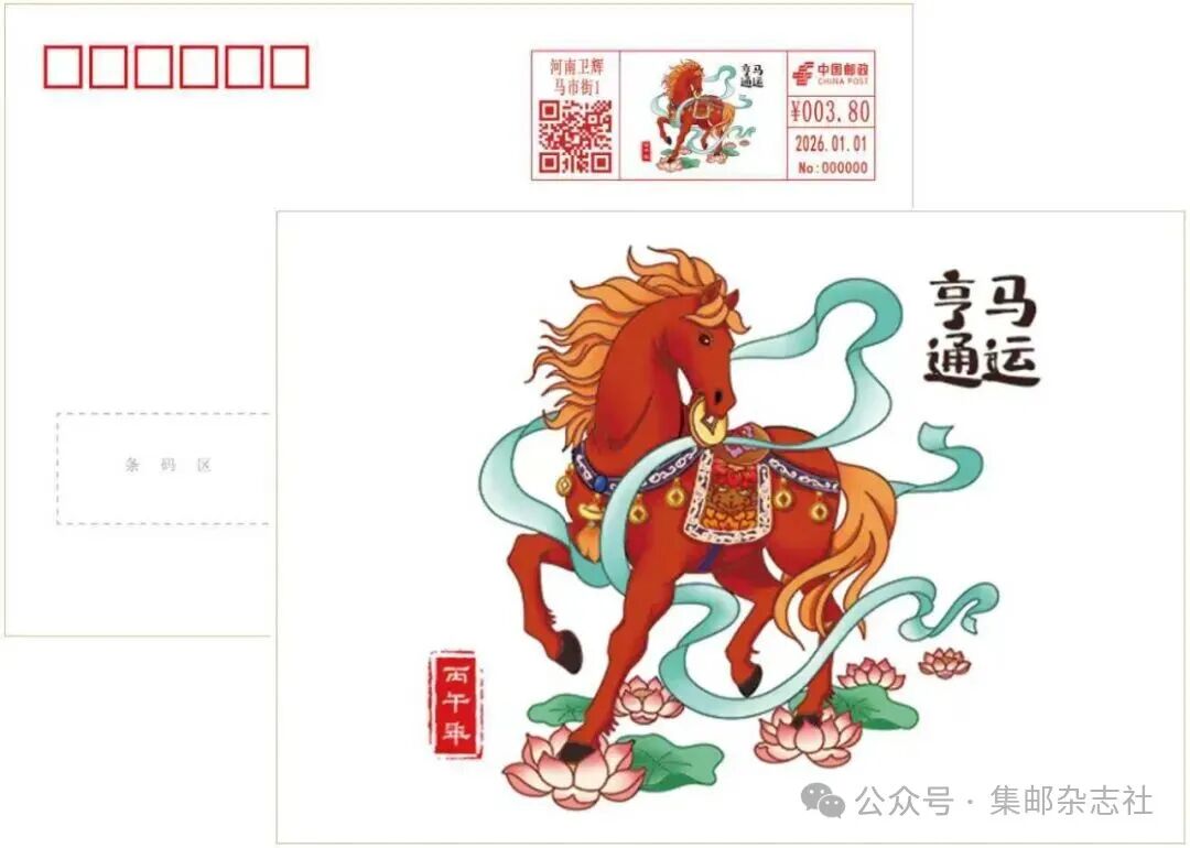 ![]() ![]() 经中国邮政集团有限公司批准,河南省新乡市卫辉市马市街邮政支局将于2026年1月1日启用“马运亨通”彩色数字打印型邮资机戳各一枚。 为方便大家收藏,《集邮》杂志微店上架了相关的实寄产品。 ![]() ![]() ![]() ![]() 挂号实寄封片套装 一组2枚,包含一封一片,使用美术封、美术明信片为载体,启用首日分别加盖邮资机戳,挂号实寄给预订者。识别上方二维码即可预订。 ![]() ![]() ![]() 挂号实寄邮资明信片 使用任意一枚普通型2026贺年有奖明信片为载体,启用首日加盖邮资机戳,另盖河南卫辉马市街邮政支局日戳,挂号实寄给预订者。识别上方二维码即可预订。