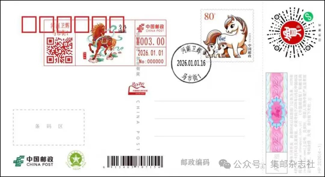 使用任意一枚普通型2026贺年有奖明信片为载体,启用首日加盖邮资机戳,另盖河南卫辉马市街邮政支局日戳,挂号实寄给预订者。识别上方二维码即可预订。