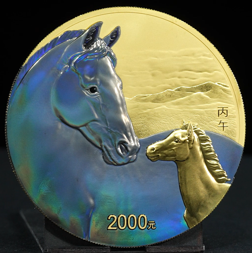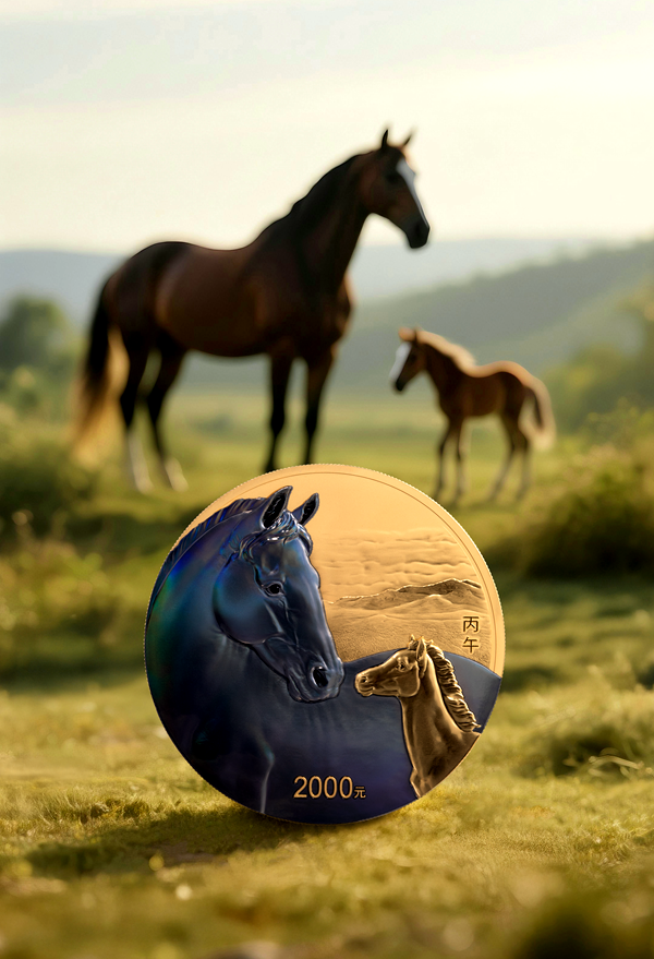 色泽多元,呈现令人炫目的动态美感。尤其是母马,在光变鳞彩工艺基础上叠加了镀黑工艺。光变鳞彩工艺独特之处在于,从不同视角、不同光线下观赏币面,会呈现出层次丰富、色彩斑斓的视觉效果;镀黑工艺让黄金呈现黑色或深色色调,既有复古气息,又有神秘、潮酷个性。当光线从不同角度照射时,母马身上产生不同的光影变化;当光线流转时,乌黑中又透出彩虹般光泽,和金属本身的色泽融为一体,既庄重又有时尚感。这些创新工艺的运用,增添了“灵魂色彩”,提升了纪念币表现力。