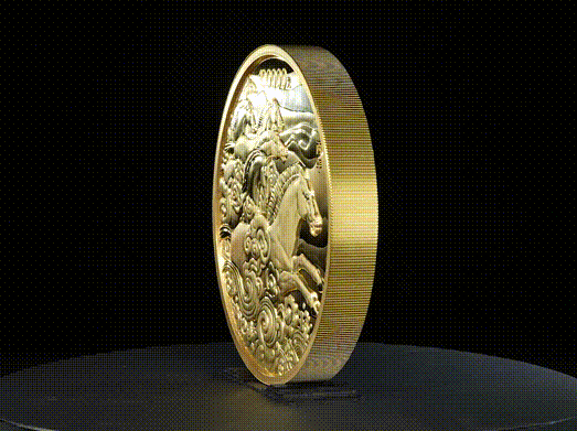 3克金币由于直径仅18毫米,为了更好展现马身上繁复的细节花纹,运用了微缩工艺,画面纤毫毕现,背景则采用浅浮雕和光变鳞彩工艺,流光溢彩。