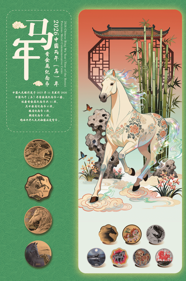 2026年恰逢中国传统丙午马年,为传承悠久的生肖文化,迎接农历新年的到来,中国人民银行于2025年11月26日发行了2026中国丙午(马)年贵金属纪念币一套。该套贵金属纪念币共11枚,包括金币6枚,银币4枚,铂币1枚,均为中华人民共和国法定货币。作为年度重头戏,该套马年生肖贵金属纪念币备受广大藏友关注,11枚币一币一图,设计、工艺、寓意等均颇具匠心巧思,可圈可点。