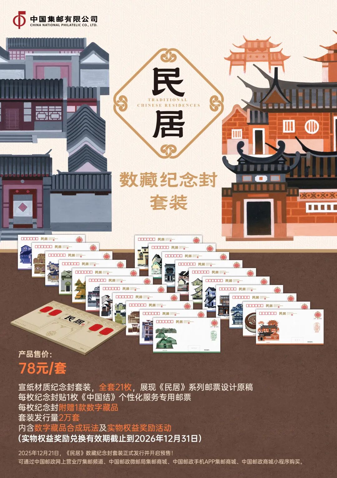 2025年12月21日,《民居》数藏纪念封套装正式发行并开启预售!可通过中国邮政网上营业厅集邮频道、中国邮政微邮局集邮商城、中国邮政手机APP集邮商城、中国邮政商城小程序购买。