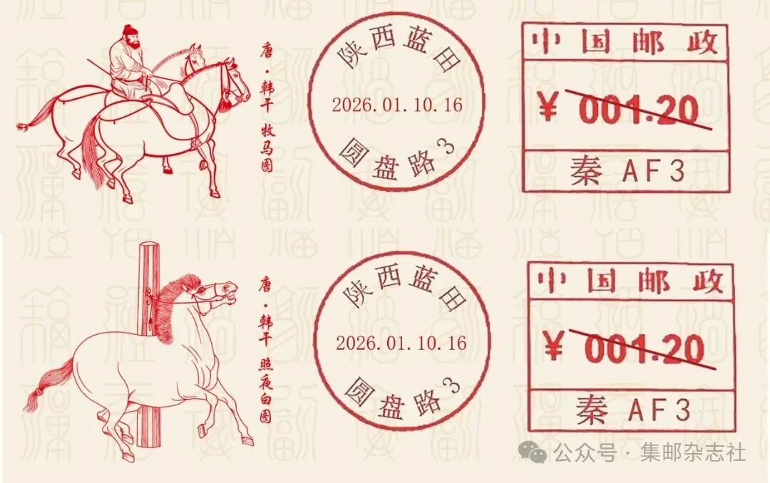 经中国邮政集团有限公司批准,陕西省蓝田县邮政分公司将于2026年1月10日启用“牧马图”“照夜白图”邮资机戳各一枚。