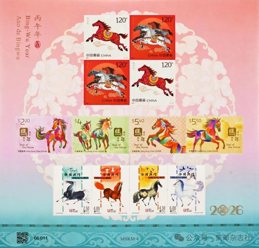 注:同时发行《丙午年》邮票版式三(整张枚数:2套4枚;整张规格:120mm×160mm;边饰设计者:刘喜飞;对联作者:常江)。计划发行数量:288万版。用于赠送给预订2026年全年纪特邮票的预订户。