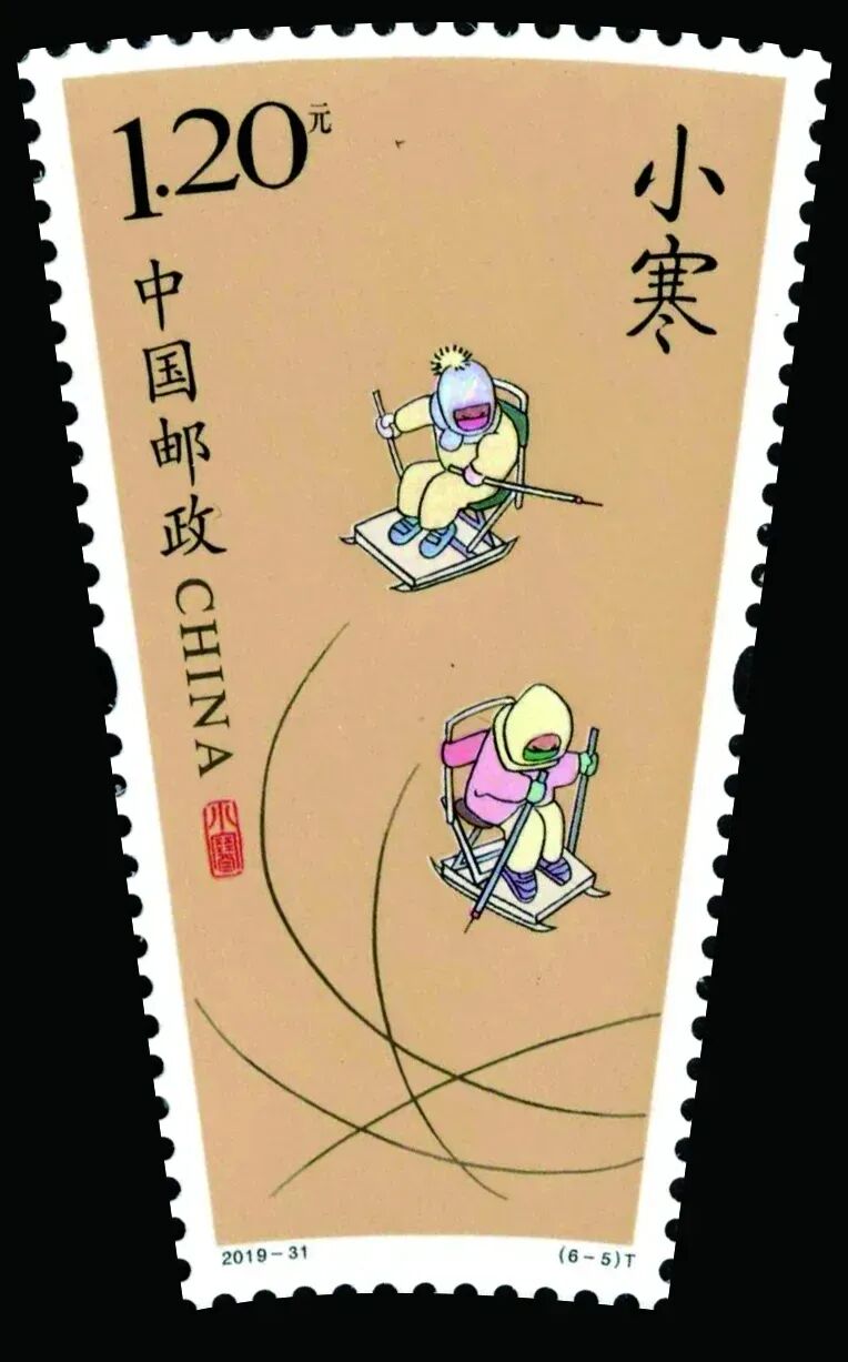 小寒时节,人们往往在家围炉窝冬。然而此时室外冰面厚实,积雪未消,也是开展冰雪运动的好时节。《二十四节气(四)》特种邮票中的“小寒”一枚,便展现了一幅儿童在冰场溜冰嬉戏的现代冰戏图。