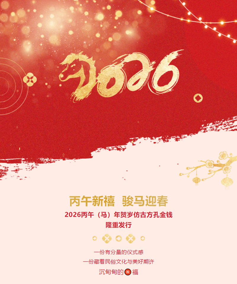 2026丙午(马)年贺岁仿古方孔金钱将于即日起在全国各经销渠道陆续面市,愿此枚“金钱”伴你事事顺遂,幸福安康,骏马奔腾,前程似锦!