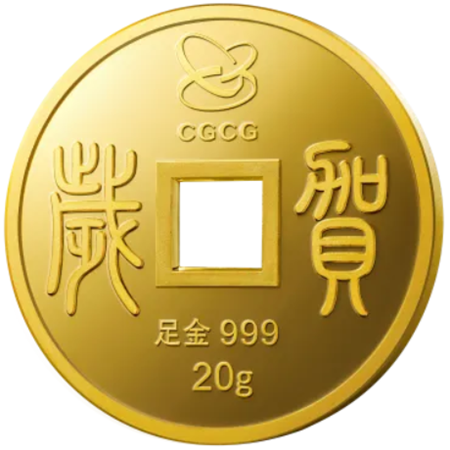 马年贺岁金钱背面延续往年系列设计,中部核心为右至左序的“贺岁”二字,呼应传统节庆主题,顶端加铸中国金币集团有限公司官方标识及英文缩写,底部至上而下分别为足金999及对应规格3g、6g、20g标注,产品信息一目了然。
