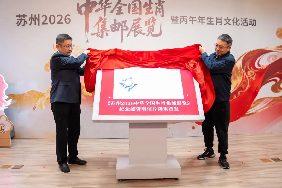 活动现场还相继举行了《苏州2026中华全国生肖集邮展览》纪念邮资明信片首发仪式及吴文化博物馆主题邮局揭牌仪式。