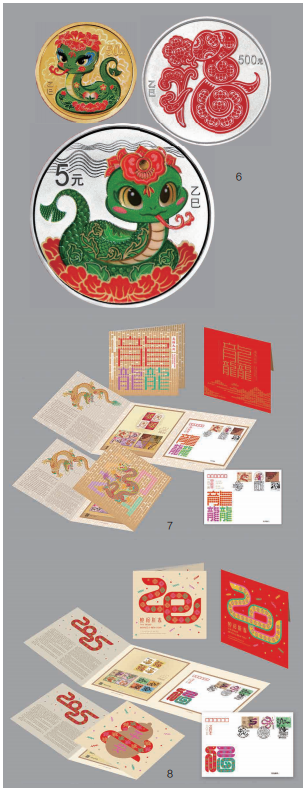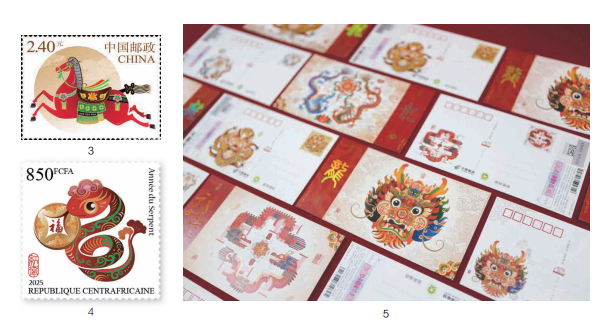 清华大学美术学院视觉传达设计系教授王红卫先后参与过中国邮政多套邮票的设计,在他心中始终有个心愿,就是设计一套生肖邮票。王红卫教授与多位家人都属马,他平日里收集了大量马的工艺品与纪念品。早在2014年,王红卫和其研究生郝望舒同学设计创作了中国邮政贺年有奖马年生肖邮资图(图3),由此对生肖产生了浓厚的兴趣。 “自那时起,我便怀揣着一个梦想,希望有朝一日能够亲手设计马年生肖邮票。”王红卫表示,从那时起,生肖成为他教学与研究的重要方向,每年都会带领研究生团队对生肖动物的含义、传统文化、民俗寓意等方面进行深入调研,挖掘生肖动物核心精神, 创作大量具有实验性的生肖作品。近年来,王红卫带领团队先后设计了中非共和国蛇年(2025年)生肖邮票(图4),中国邮政虎年(2022年)、龙年(2024年)贺年有奖贺卡邮资图(图5),中国人民银行2025年(图6)、2026年贵金属纪念币,并为2021年春节联欢晚会设计了春晚福礼——“福牛春碗”,让捧着春碗看春晚成为热潮,再到后来的“龘龘春碗”、“五龙春盘”等文创产品,都是出于王红卫团队对不同年份的生肖内在精神的一种表达。