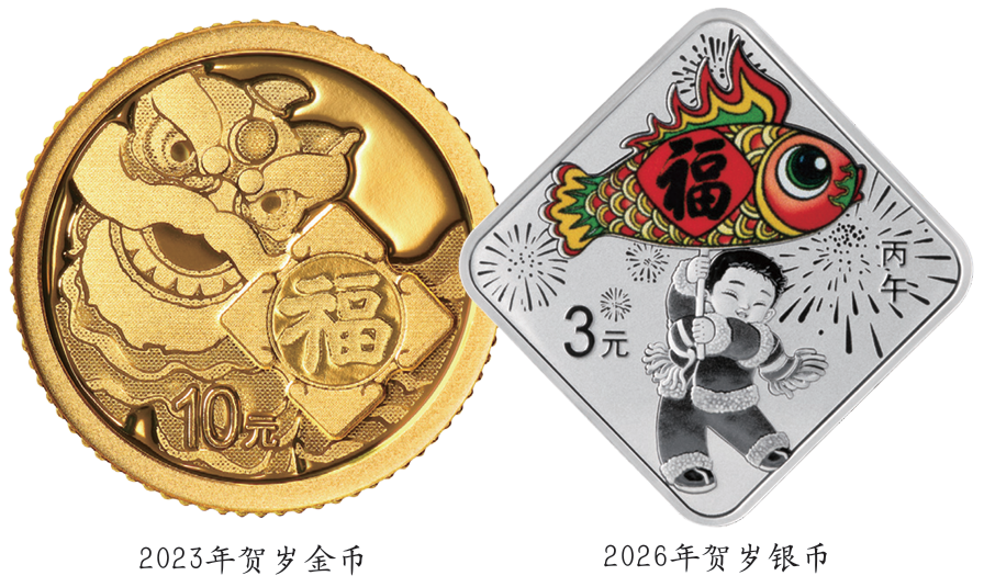 鳌鱼是传统鱼灯设计的重要灵感来源,两者寓意相承,都包含着“吉运、跃升”的祝愿。在2026年贺岁8克菱形银币上,画面生动呈现了鱼灯游弋、流光溢彩的场景,既展现了贺岁佳节欢庆盛况,亦传递出人民对年年有余、富足安康的美好祈福。