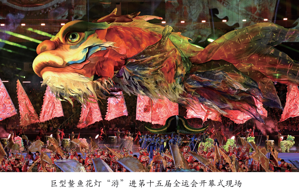 吉兽也是贺岁币上的常见元素。2023年贺岁金银币上就有一只身着缀饰的岭南醒狮,它昂首阔步而来,跳跃、翻滚、嬉戏,阵阵的锣鼓声与热烈的欢呼喝彩声似乎就在耳边。在2025年11月举行的第十五届全运会开幕式上,舞台中央伴随着灯光亮起,另一头彩色巨兽翩然而至,它遨游于场馆半空,成为整场盛会的亮点。这名吉兽名唤鳌鱼,是传说中“鲤跃龙门”化龙前的形态,寓意独占鳌头、勇攀高峰。