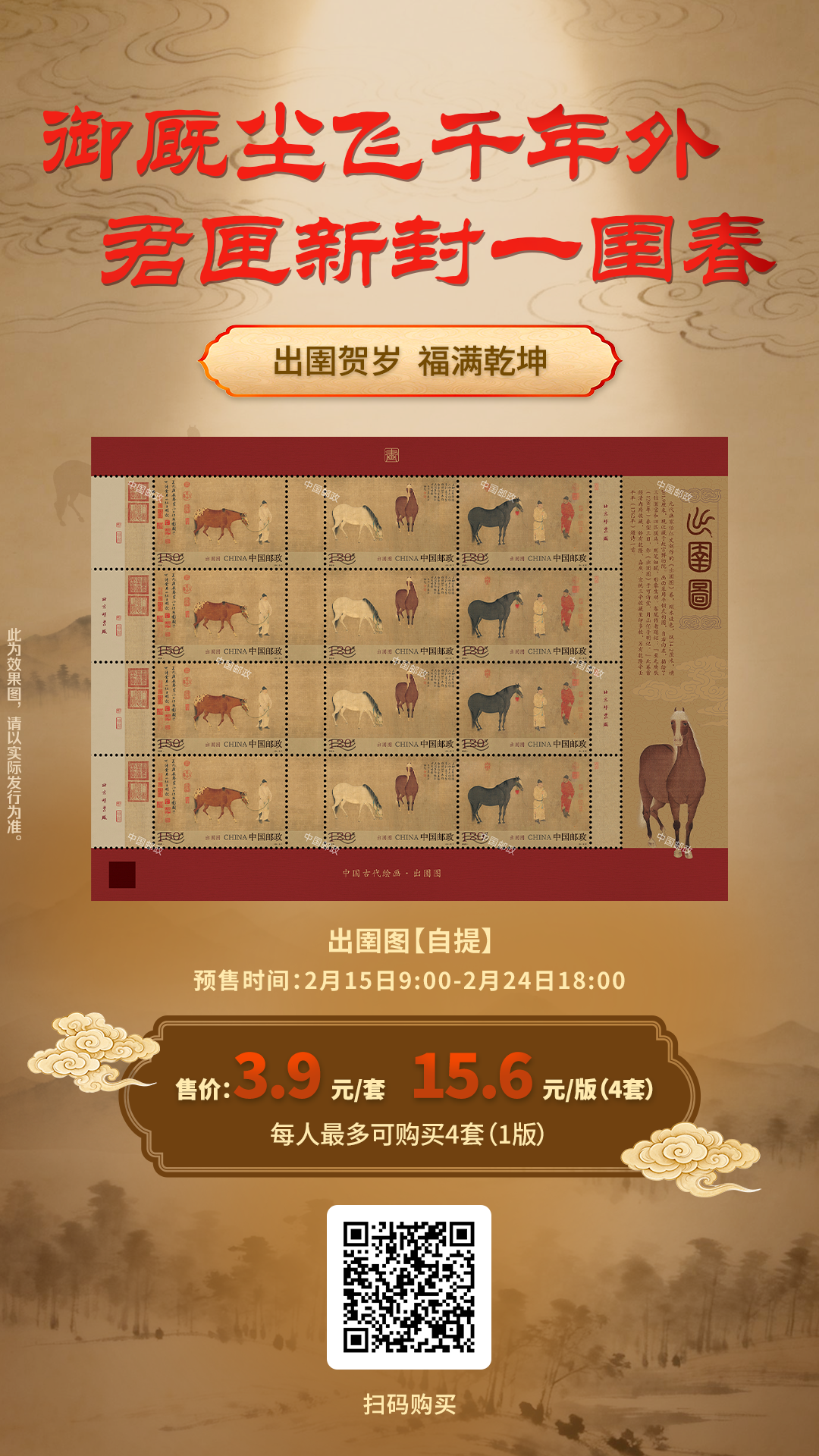 中国历代名画中,众多画家将笔墨落在表现人与马和谐共荣的场景中,成就了一幅幅传世佳作。2026年适逢马年,中国邮政将于3月3日发行《出圉图》特种邮票一套3枚,以画为媒,拓展生肖文化内涵。